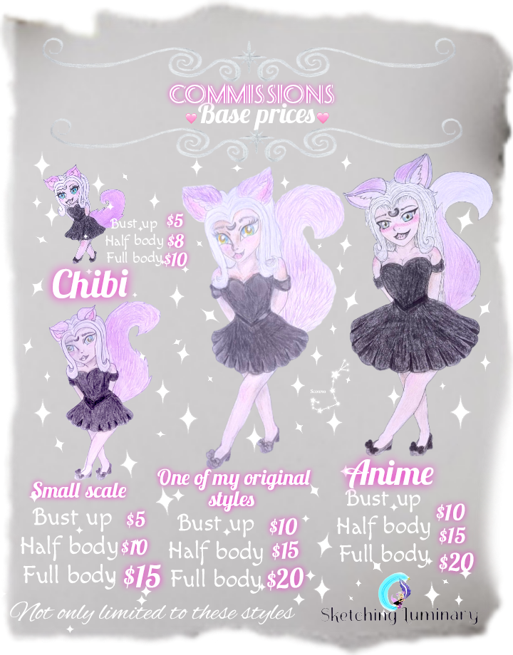 All prices above are base prices. Things that may increase the price are complex character designs, number of characters/ creatures or and pets, not being able to provide a good visual reference, complex backgrounds and amount of detail in the image in general.